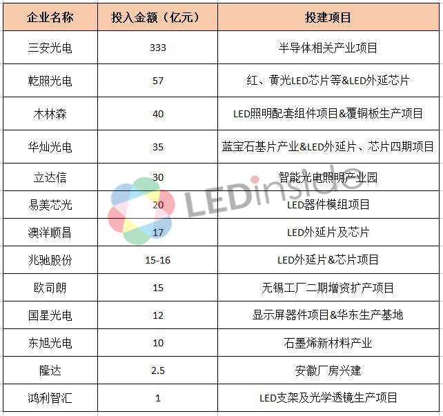 2017年LED行业亿级扩产大项目一览